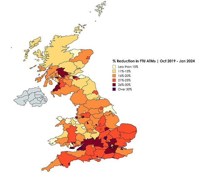 În Hayes și Harlington, în vestul Londrei, 100 din cele 189 de bancomate au fost închise din 2019. În North Somerset, 30 din cele 57 au dispărut. De asemenea, în Cheadle, la sud de Manchester, 29 din 55 au fost închise.