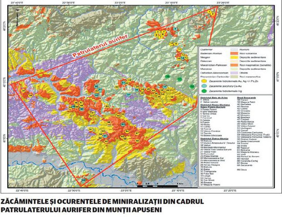Prima idee scoate în evidenţă faptul că avem un patrulater auro-argintifer în Munţii Apuseni, iar din rezervele neregenerabile se pot extrage anual, timp de 20 de ani, un milion de tone de minereu, cu un profit de circa 54 miliarde de dolari. Avem 230 de zăcăminte. În 140 dintre ele, aurul este principalul element, iar în celelalte 90 aurul este elementul secundar.