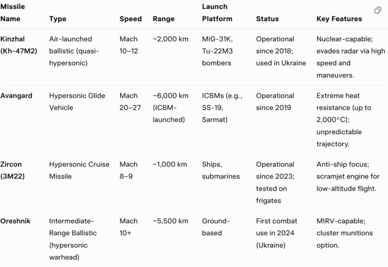 Aceasta le face dificil de interceptat cu sistemele tradiționale de apărare antirachetă, precum Patriot sau Aegis din SUA. Rachete hipersonice sunt clasificate în două tipuri principale: Vehicule hipersonice planante (HGV), care sunt lansate de un propulsor de rachetă și apoi planează prin atmosferă, și Rachete de croazieră hipersonice (HCM), care utilizează motoare avansate cu respirație aeriană, precum scramjet.