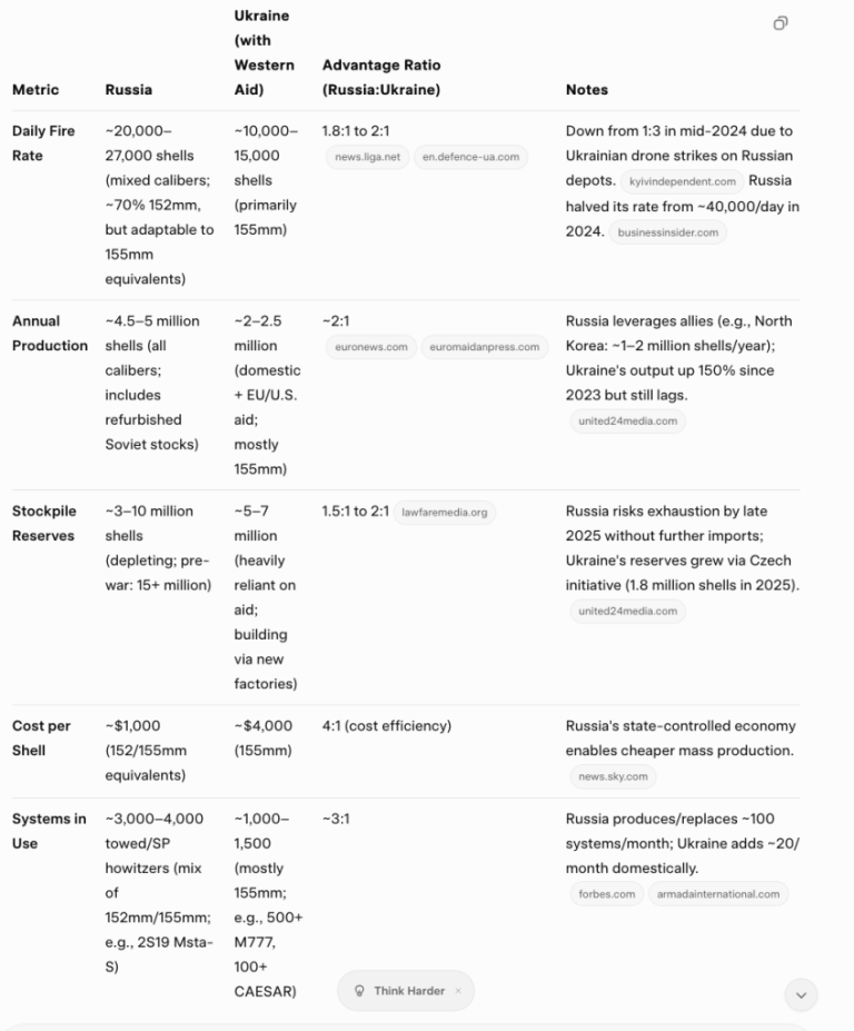 Acest avantaj provine din stocurile masive ale Rusiei dinainte de război, mobilizarea industrială în timpul războiului și aprovizionarea externă, ceea ce îi permite să mențină rate de foc mai mari, în ciuda contraatacurilor ucrainene asupra depozitelor și producției.