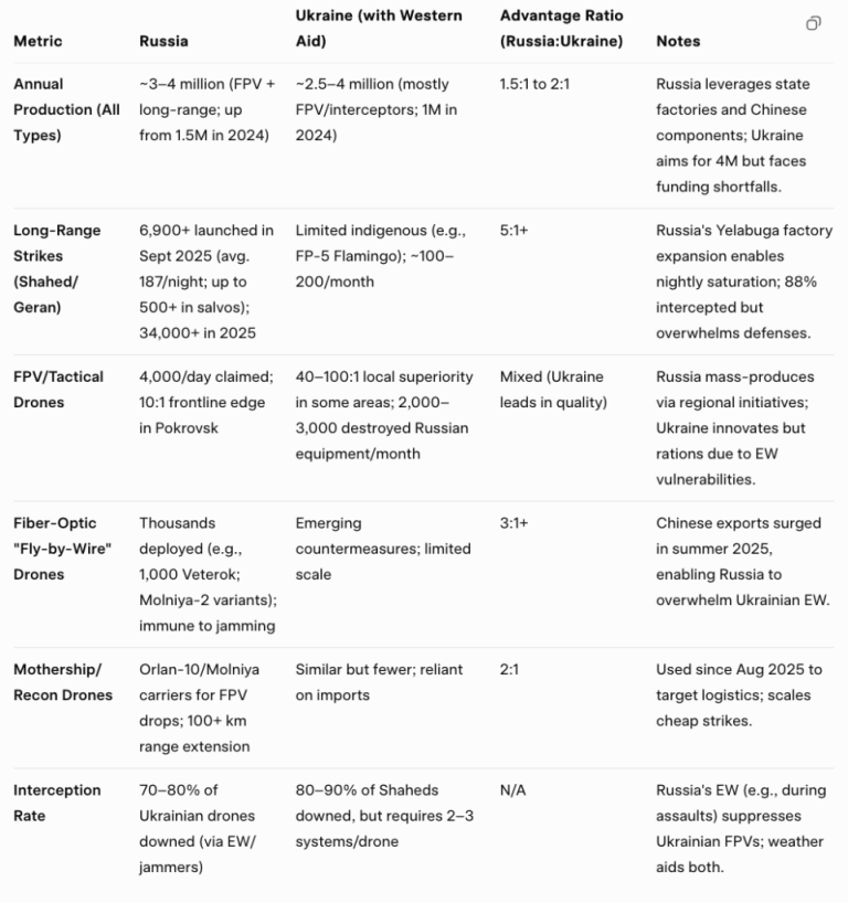 În ansamblu, superioritatea Rusiei în materie de drone contribuie la un raport de 10:1 pe linia frontului în unele sectoare, conform rapoartelor ucrainene, deși contramăsurile Ucrainei (de exemplu, 500-800 de drone interceptor zilnic până în noiembrie) reduc diferența.