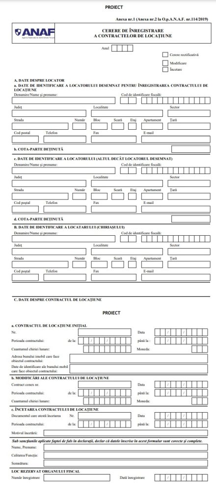 Cererea de înregistrare a contractelor de locațiune se completează și se depune de către: