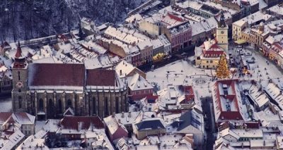 În foto evoluția in timp a cunoscutei zone din centrul Brașovului, Piața Sfatului, in 1914 și cum arata acum (dupa modernizarea coordonata de fostul prim secretar Ion Radu), iarna.