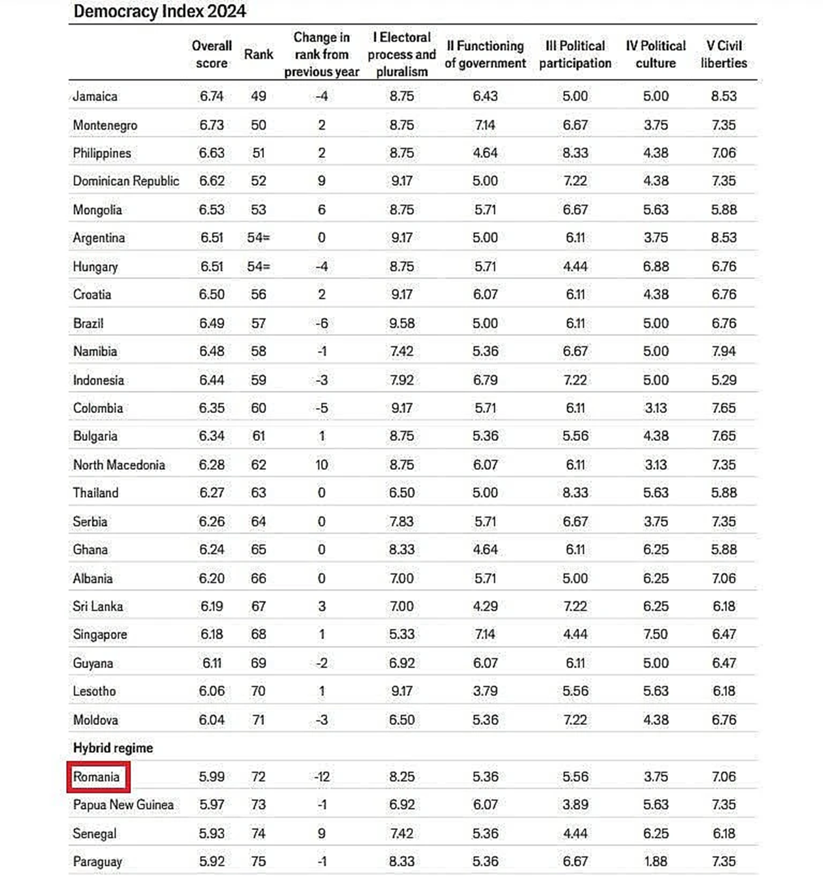Deloc întâmplător, asta s-a ales de democrația noastră parlamentară după 35 de ani, iar primii care au constatat-o sunt cei de la Economist Intelligence Unit (EIU), care in indexul democrației la nivel global ne-au retrogradat la nivelul, fără precedent, de „regim hibrid”(vezi foto jos).
