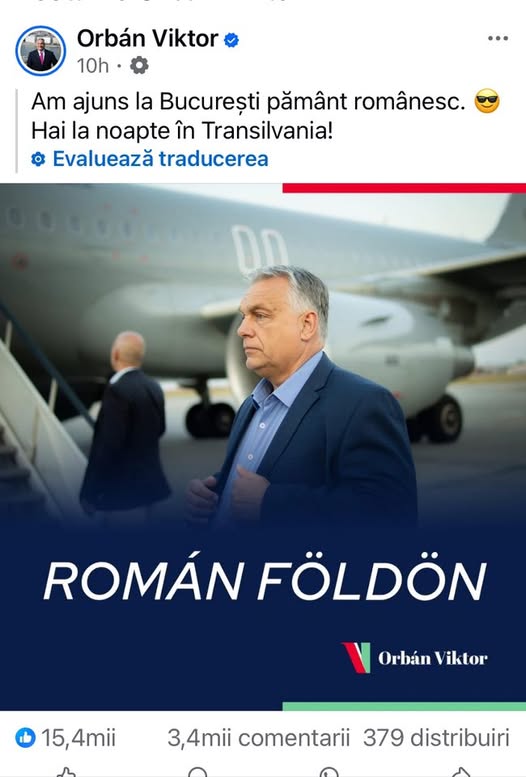 📌 Orban Viktor în mod deliberat a ales să umilească România. A postat pe Facebook mesajul „Am ajuns la București, pe pământ românesc. Diseară mergem în Ardeal!”.