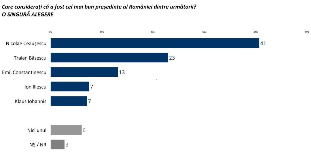 Iar într-un sondaj din ianuarie 2024 rezultă că aproape jumătate din români (41%) consideră că Ceaușescu ă a fost cel mai bun președinte al României.