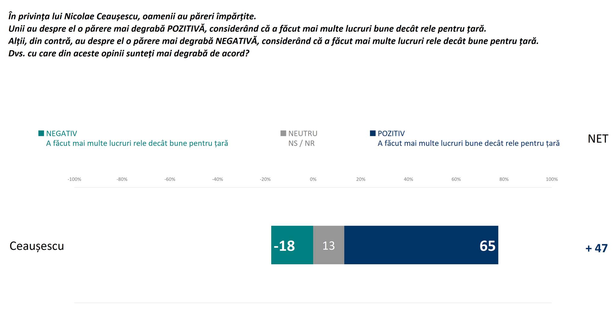 Astfel, într-un sondaj Sociopol din decembrie 2023 a rezultat că două treimi (65%) din români consideră că Ceaușescu a făcut mai multe lucruri bune decât rele pentru țară.
