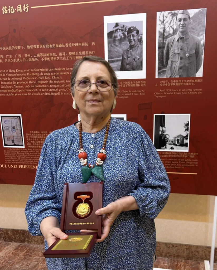 Ambasada Republicii Populare Chineze a decernat, astăzi, doamnei Tania Iancu (foto), Medalia Comemorativă “80 de ani de la victoria în Războiul de Rezistență împotriva Agresiunii Japoneze”, o medalie acordată în memoria Dr. David Iancu, unul dintre medicii români care au ajutat poporul și armata populară chineză. Ceremonia a avut loc în ziua în care, la Beijing, a fost organizată o mare paradă militară și populară pentru a marca cei 80 de ani de la victoria în fața agresiunii japoneze și în cel de-Al Doilea Război Mondial.