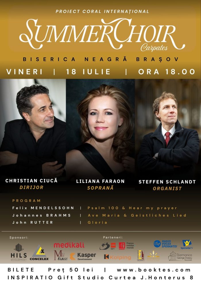 În data de 18 iulie, ora 18.00, Biserica Evanghelică C.A. din România – Parohia Brașov invită publicul la un concert de cor și orgă susținut în cadrul unui proiect coral internațional, Summer Choir Carpates, desfășurat în perioada 14-19 iulie, la Brașov, sub conducerea muzicală a dirijorului francez, de origine română, Christian Ciucă.