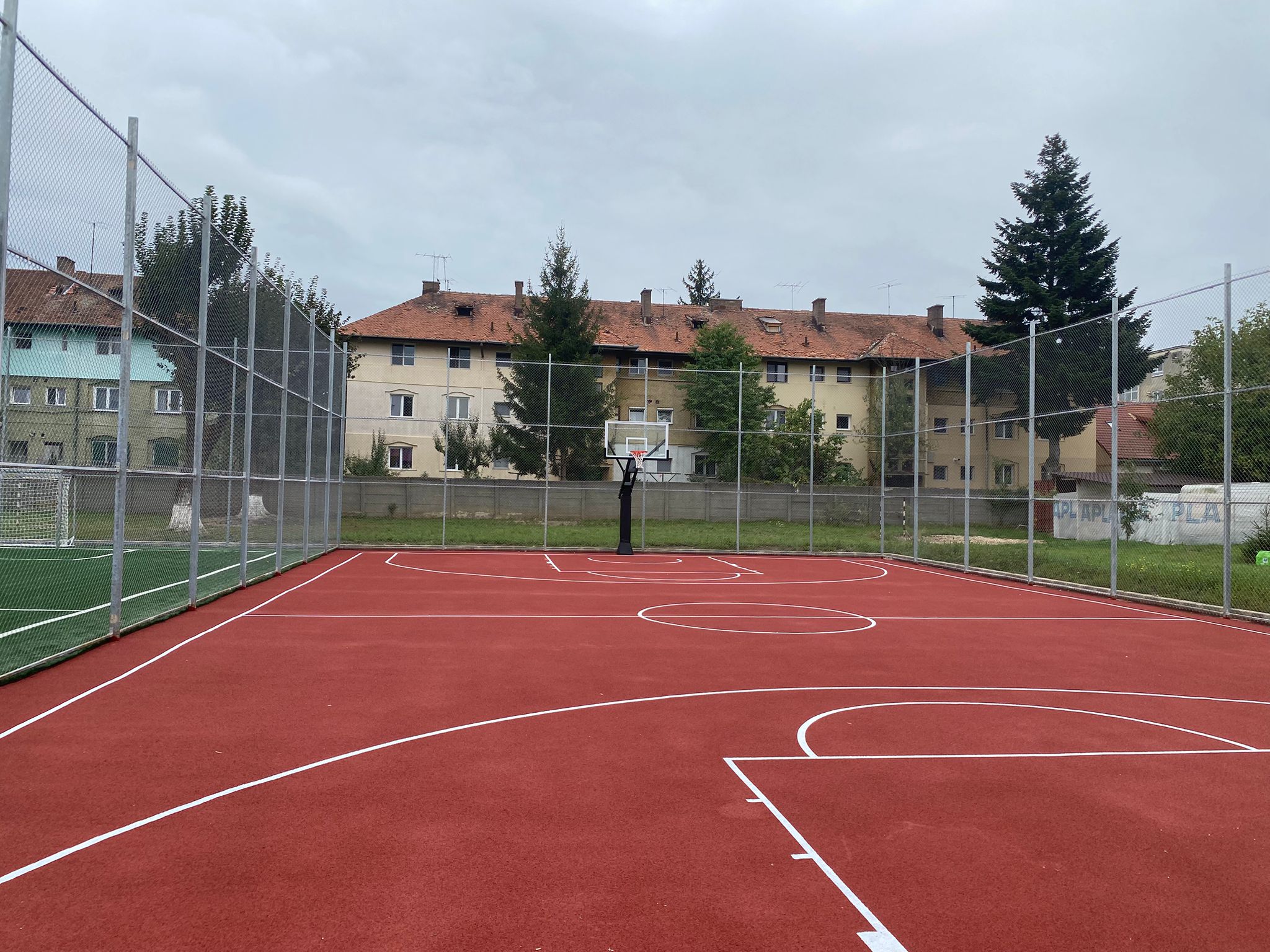 - aplicarea de marcaje rezistente; montarea de panouri de baschet, porți metalice de fotbal sau handbal robuste, fixate în sol prin betonare, dotate cu plase textile;