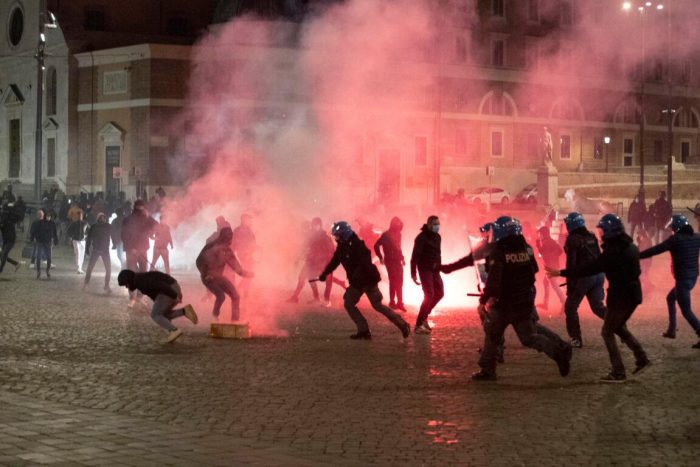 Dacă erai un turist aflat în vizită la miezul nopții dintre 24-25 octombrie 2020 în piața Popolo din Roma, puteai să crezi că este Revelionul tradițional din Ceteatea Eternă. De fapt în noaptea de sâmbătă spre duminică a izbucnit focul de artificii la propiu și la figurat între forțele de ordine și manifestanții ce protestează împotriva noilor restricții impuse de guvern și având menirea să frâneze propagarea virusului covid-19.