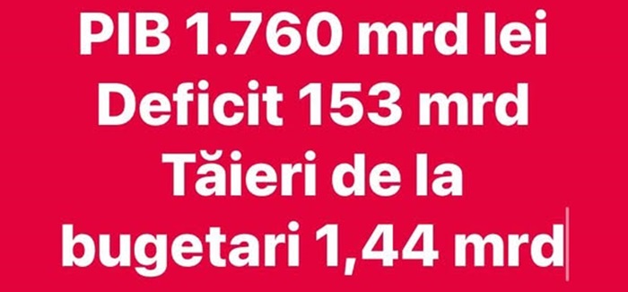 Vedeți în foto cifrele. Produsul Intern Brut al României este de 1.760 miliarde lei și deficitul bugetar a fost de 153 miliarde lei. Tăierea sporurilor bugetarilor reprezintă o economie de 1,4 miliarde lei.