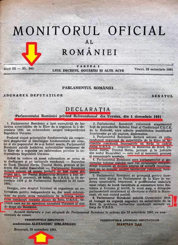 DECLARATIA din 28 noiembrie 1991 a Parlamentului Romaniei privind Referendumul din Ucraina,...
