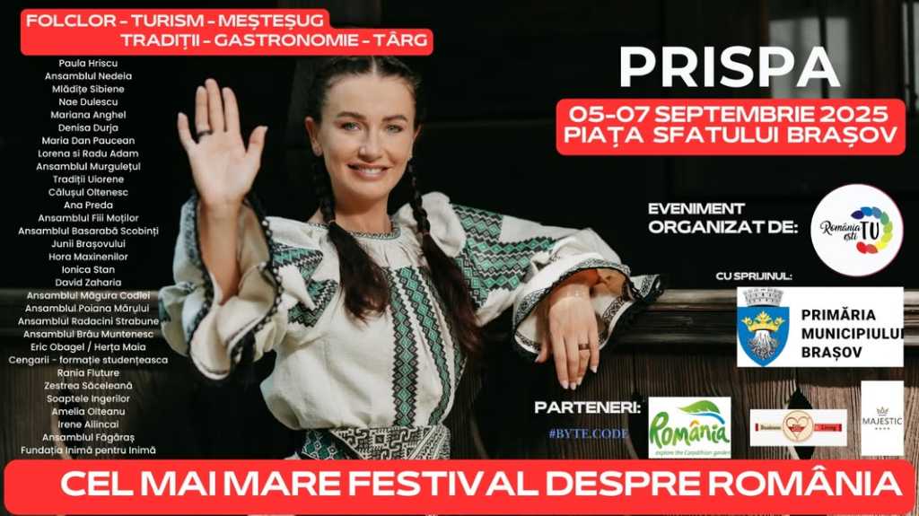 Între 5 și 7 septembrie 2025, Piața Sfatului din Brașov va găzdui Festivalul PRISPA, un eveniment unic prin amploare și semnificație, dedicat tradițiilor, comunităților și valorilor românești. Festivalul este organizat de Asociația Construim o Țară, prin proiectul România ești TU, în parteneriat cu Primăria Municipiului Brașov și cu Ministerul Economiei, Antreprenoriatului, Digitalizării și Turismului.