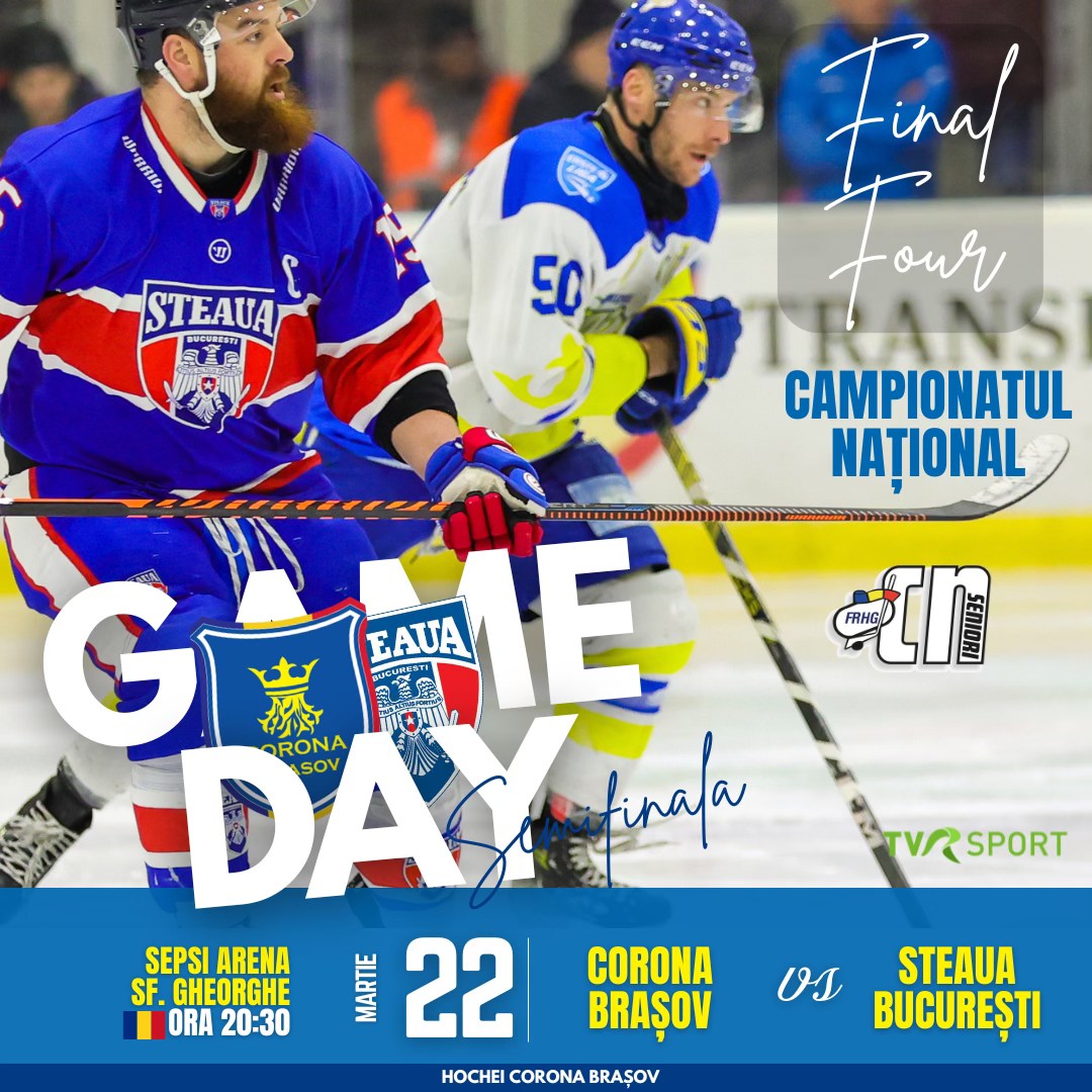 În acest weekend, la Sf. Gheorghe se desfășoară final four-ul Campionatului Național de hochei. Corona va lupta pentru titlu, pe care l-a câștigat sezonul trecut. Prima bătălie, din semifinale, are loc sâmbătă seară de la ora 20.30, contra celor de la Steaua București. Brașovenii sunt în căutarea titlului cu numărul 7 din istorie, în timp ce bucureștenii sunt cel mai titrat club din țară cu 40 de campionate cucerite, cu ultimul venit însă în 2006. Corona este favorită sâmbătă seară pe gheața din Covasna după ce câștigat sezonul regulat intern, dar mai ales după prestația excelentă din Erste Liga unde a eliminat în primul tur din play-off pe cei de la Ferencvaros. Seria contra maghiarilor a fost plătită însă scump de campioni. După accidentarea la umăr a lui Evgheni Skachkov a venit și a doua mare lovitură. David Levin are două coaste rupte și va rata restul sezonului. Jucătorul israelian a fost cel mai bun marcator al primei părți din play-off-ul Erste Liga și a impresionat alături de Radim Valchar. În schimb la antrenamente au revenit în această săptămână Roberto Gliga și Philippe Cornet. La Sfântul Gheorghe prima semifinală aduce față în față rivalele din Harghita, Sport Club Miercurea Ciuc și Hochei Club Gheorgheni, de la ora 17.30. Finala campionatului național va avea loc duminică de la ora 19.30. Partidele sunt transmise de TVR Sport.