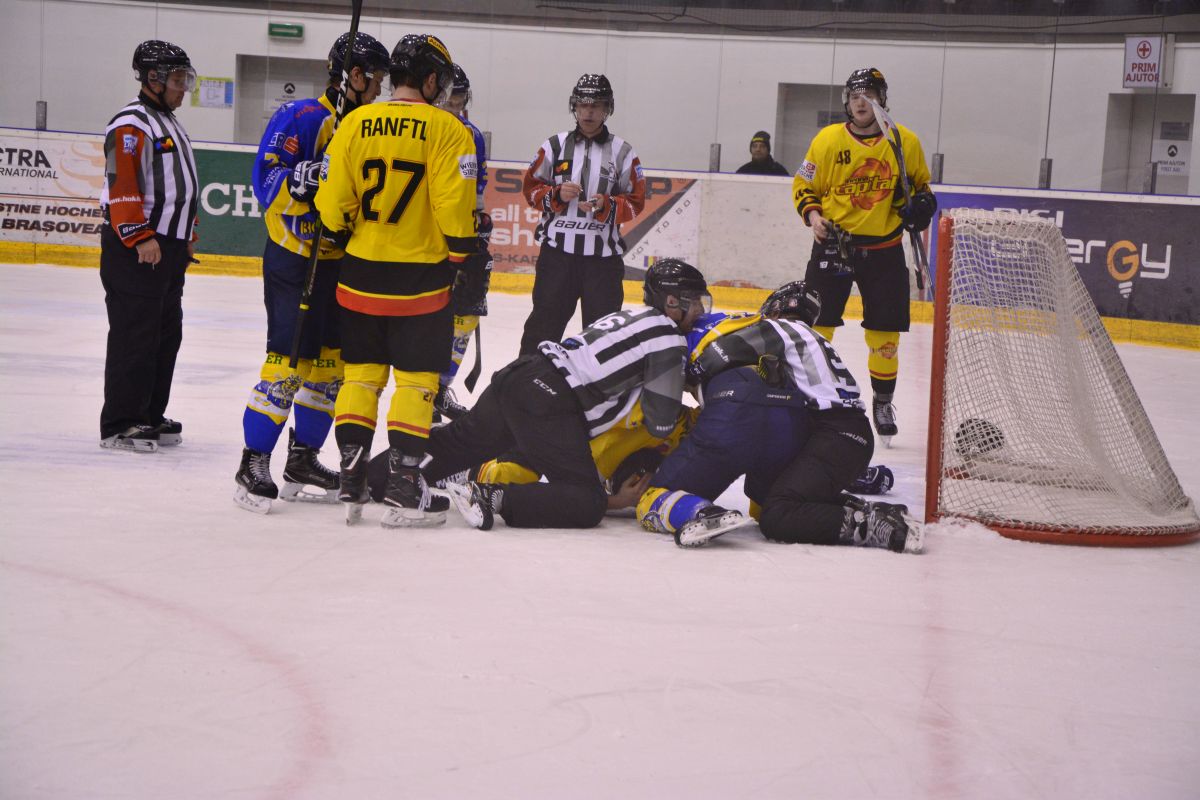 Primul meci din faza calificărilor pentru playoff-ul Erste Liga, a rezervat „lupilor” echipa clasată pe ultimul loc, Vienna Capitals. Echipa Brașovului a luat însa în serios meciul și a jucat la turație maximă, lucru aplaudat de fanii din tribune. Corona a deschis rapid scorul, majorându-l apoi în ritm accelerat, astfel încât după numai 15 minute conducea cu 4-0, prin reușitele lui Knyazev (min. 3’21’’), Trancă (min. 5’49’’ și 9’17’’) și Yemelianenko (min. 14’57’’). Golul oaspeților, din finalul primei reprze, nu a schimbat impresia unei prime părți dominate total de „lupi”. La fel s-a intamplat și în partea a doua a jocului, în care Corona a dominat cu autoritate și a înscris de trei ori prin Knyazev (min. 20’37’’), Walls (min. 38’58’’) și Saluga (min. 39’51’’). În repriza a treia nu s-au înscris goluri dar s-au împărțit cu dărnicie pumni, oaspetii provocându-și adversarii în dese rânduri și sărind la bătaie cu insistentă. În aceasta parte, arbitrii au avut mult de lucru, dictând un numar record de minute de penalizare, peste 100! Au fost vreu patru bătăi unu la unu, ca la box, arbitrii făcând eforturi mari să despartă ….perechile, care se prăbușiseră pe gheață (foto). Scor final : 7-1 și „lupii” acumulează 4 puncte după primul joc, ținând cont că echipa brașoveană a primit un punct, conform clasamentului de la finalul sezonului regulat.