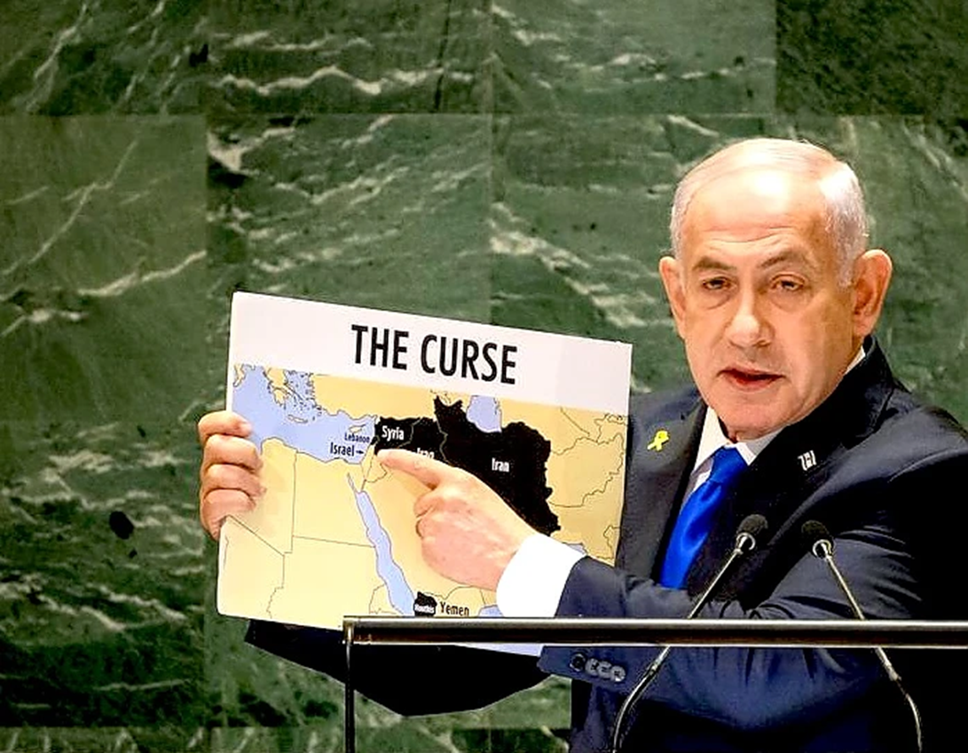 În septembrie 2023, Netanyahu a prezentat în cadrul Adunării Generale a ONU o hartă a „Noului Orient Mijlociu”, de pe care era șters complet un stat palestinian.