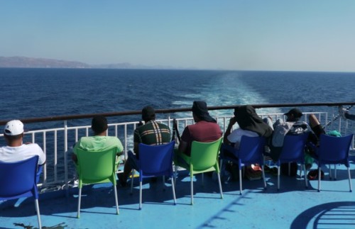 Aproximativ două treimi din totalul lor erau bărbaţi între 20-30 de ani restul era constituit din femei în aceeaşi zonă de vârstă cu copii mici, câţiva bărbaţi şi femei de vârstă mijlocie. Personalul vasului mi-a spus că s-au îmbarcat în porturile greceşti din Chios, Samos şi Mytilini (Lesvos).