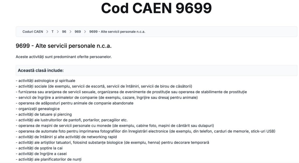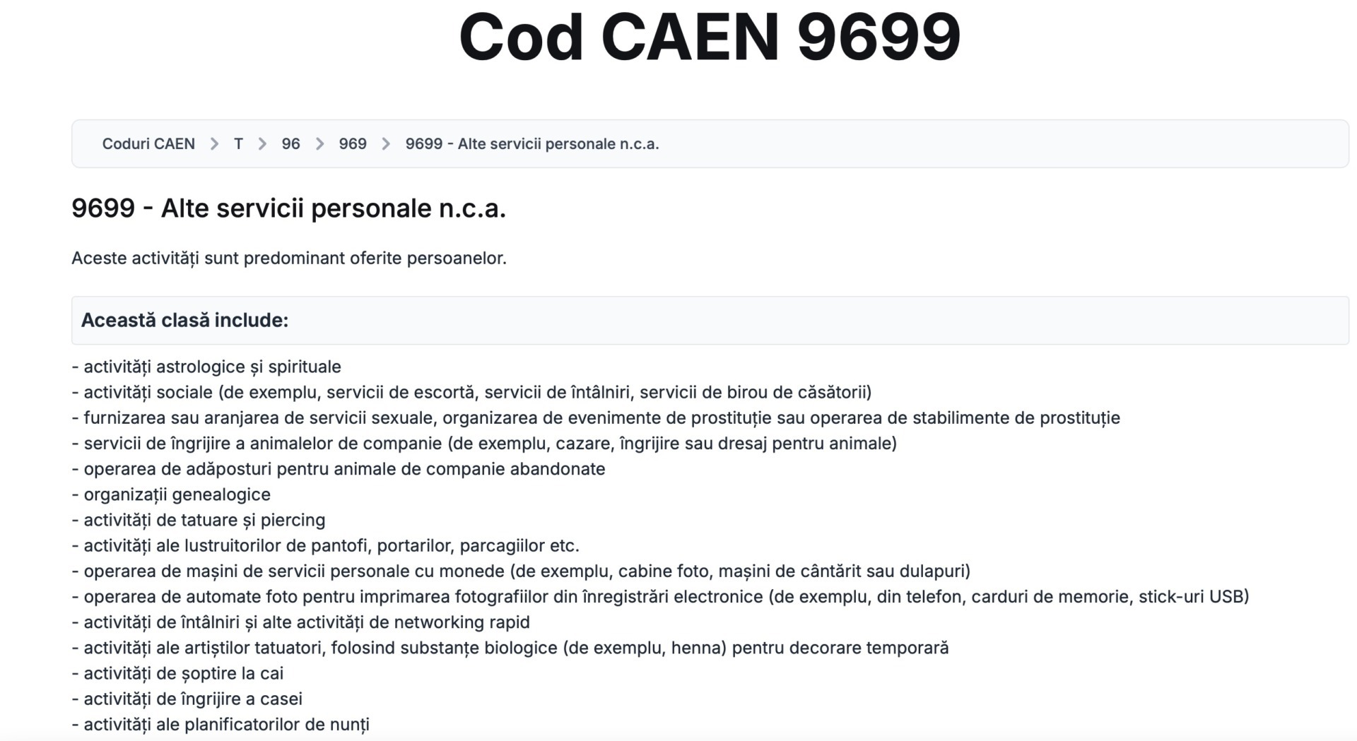 Cod CAEN 9699(vezi mai jos toate activitățile) prevede „activități sociale (de exemplu, servicii de escortă, servicii de întâlniri, servicii de birou de căsătorii)” dar și “furnizarea sau aranjarea de servicii sexuale, organizarea de evenimente de prostituție sau operarea de stabilimente de prostituție”. De asemenea, aici se regăsesc și activitățile de de astrologie și spiritism.