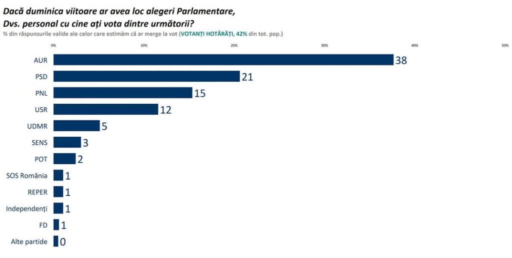 Pe primul loc se situează AUR, cu un scor de aproape 40%: 38%.