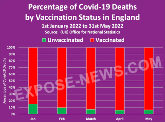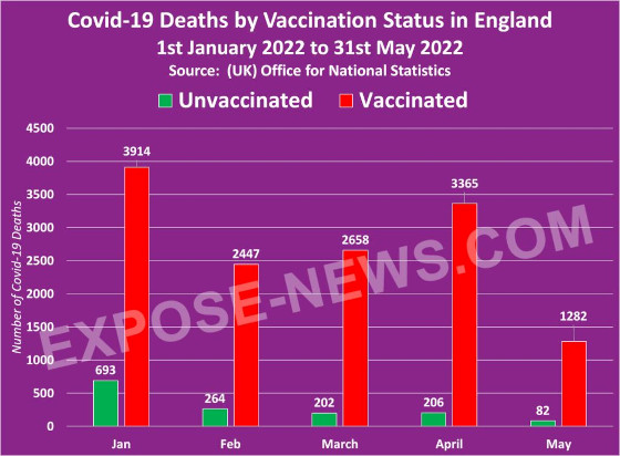 Cei de la The Expose au introdus cifrele prezentate de ONS pentru fiecare lună în următorul grafic care arată decesele de covid-19 pe lună în funcție de statutul de vaccinare în Anglia între 1 ianuarie și 31 mai 2022: