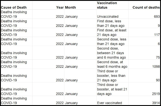 Tabelul 1 conține cifre privind ratele mortalității în funcție de statutul de vaccinare, reprezentând decesele din toate cauzele, care implică covid-19 și care nu implică covid-19. Aici se poate constata statutul privind vaccinarea al tuturor celor care au murit de covid-19 de la începutul anului 2022.