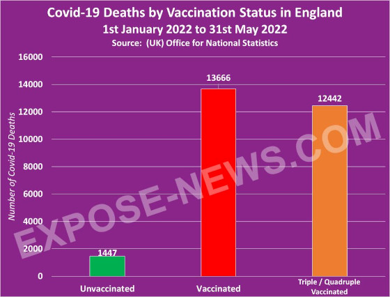 The Expose menționează că susținătorii vaccinării spun că 50% din populația Angliei a refuzat să primească a treia doză, susținând că decesele în rândul vaccinaților sunt în mare parte în rândul celor dublu vaccinați și al celor care au primit o singură doză.