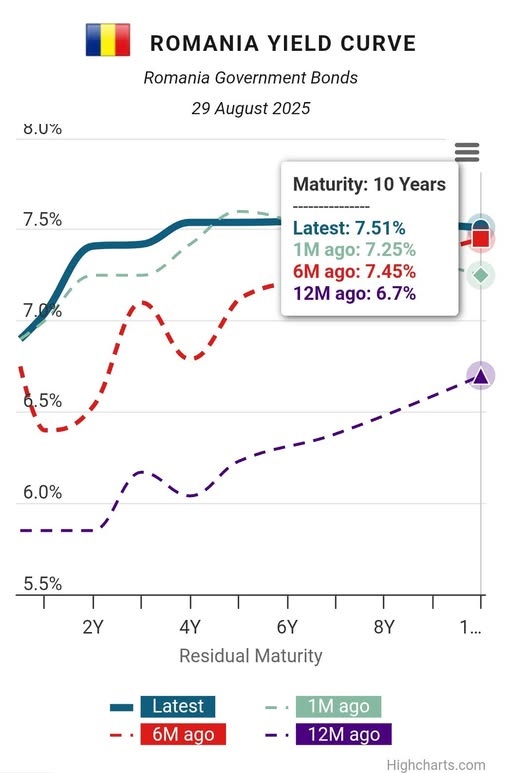 Ca să înțelegeți cât ne costă vorbăria fără noima a lui Ciolacu și a lui Bolojan, priviți graficul de mai jos: azi dobândă plătită de România pentru împrumuturi pe 10 ani este ,, văzută ” de piețe la 7,51%. Acum o luna era 7,25%, acum 6 luni 7, 45% și-acum un an 6,7%!