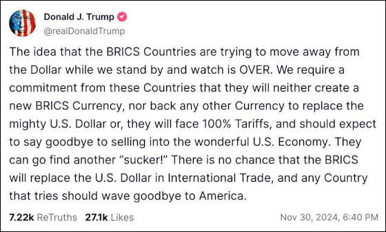 „Ideea că țările BRICS urmăresc să se desprindă de dolar în timp ce noi ne uităm este DEPĂȘITĂ. Cerem un angajament din partea acestor țări de a nu crea o nouă monedă BRICS și de a nu sprijini o altă monedă care să înlocuiască puternicul dolar american sau se vor confrunta cu tarife de 100% și ar fi cazul să se aștepte să renunțe la vânzările în minunata economie americană. Ei pot găsi un alt «fraier»! Nu există nicio șansă ca BRICS să înlocuiască dolarul american în comerțul internațional și orice țară care urmărește să facă aceasta ar fi cazul să spună adio Americii.”