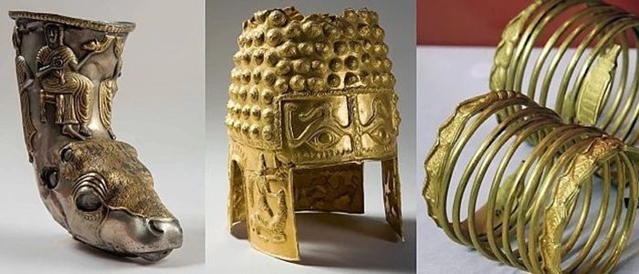 • Două diademe de aur din tezaurul de la Sărmășag, din perioada târzie a Epocii Bronzului.