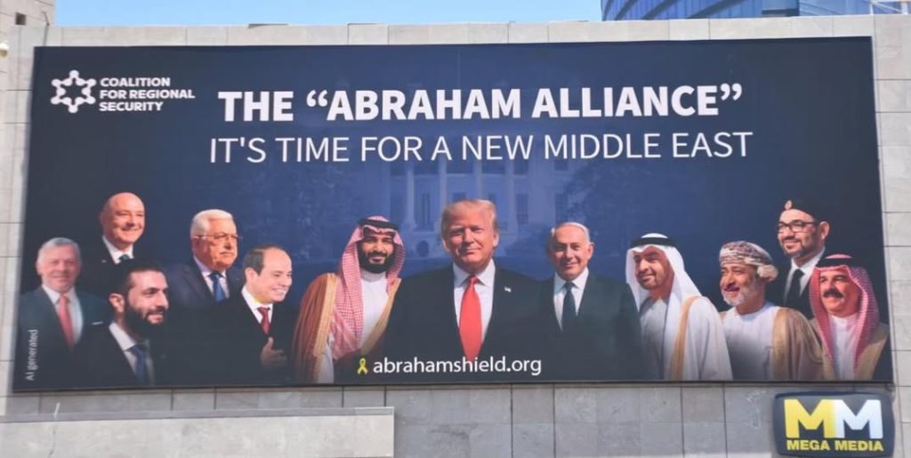 Cu sloganul „E timpul pentru un nou Orient Mijlociu”, panoul întruchipează o viziune politică în care Israelul și un bloc de state arabe se unesc într-o axă stabilizatoare, cu patronajul SUA și integrarea strategică în centrul său.