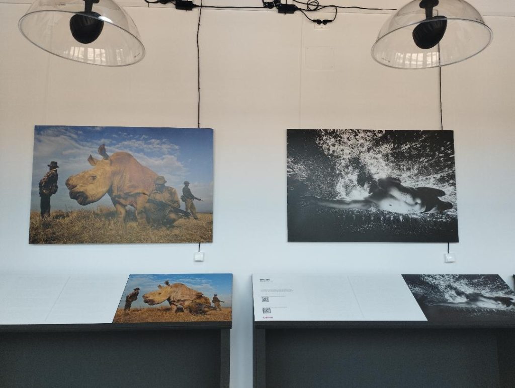 Rareș Beșliu – fotograf de wildlife: ,,Stilul meu fotografic e mai pictural, dar în cadrul acestei expoziții am ales o fotografie documentară, pentru povestea din spatele ei. Am avut norocul să particip la un moment extrem de rar, la Churchill, în Canada. E locul supranumit „capitala mondială a urșilor polari”, unde cei care se apropie prea mult de oameni sunt băgați la închisoare, pentru a le da o lecție. Urșii care se întorc de prea multe ori sunt transportați cu elicopterul într-un ținut îndepărtat, unde pot fi vânați. În fotografia mea e surprins chiar momentul de dinaintea zborului, când ursul este sedat, legat la ochi pe targă, și urmează să fie „ridicat la cer”.